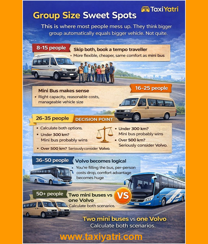 8-15 people → Skip both, book a tempo traveller More flexible, cheaper, same comfort as mini bus